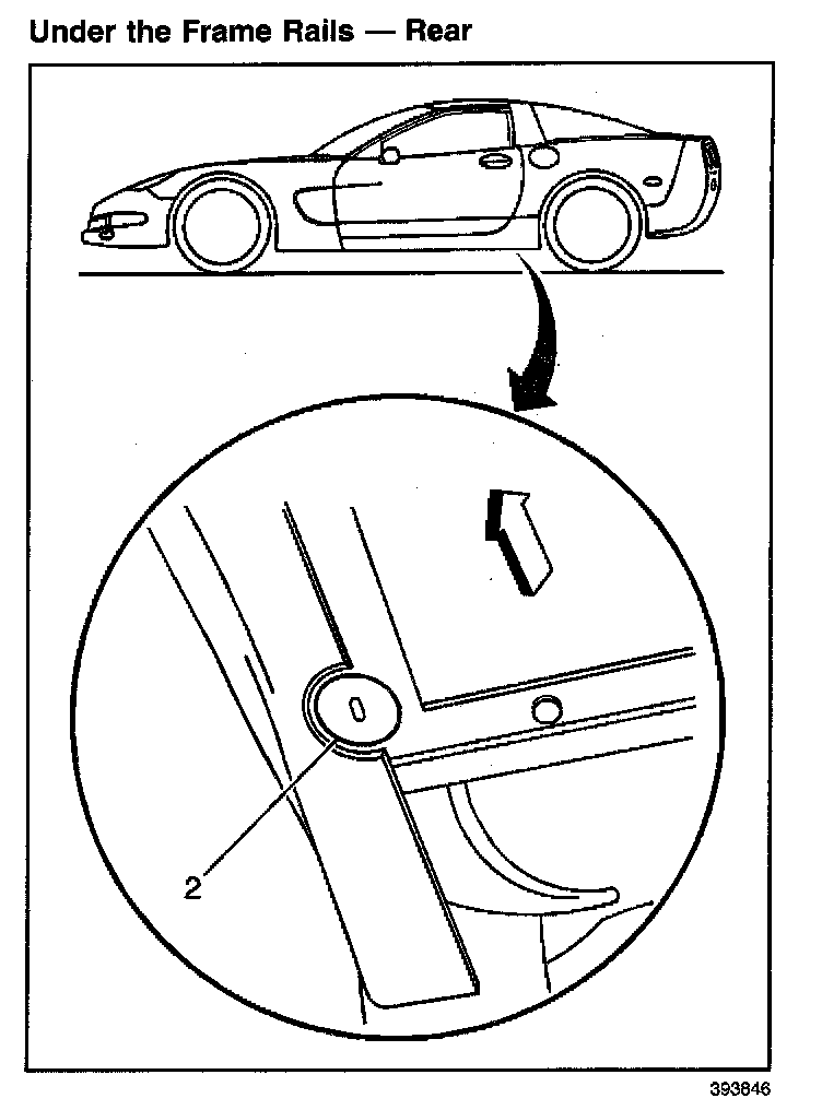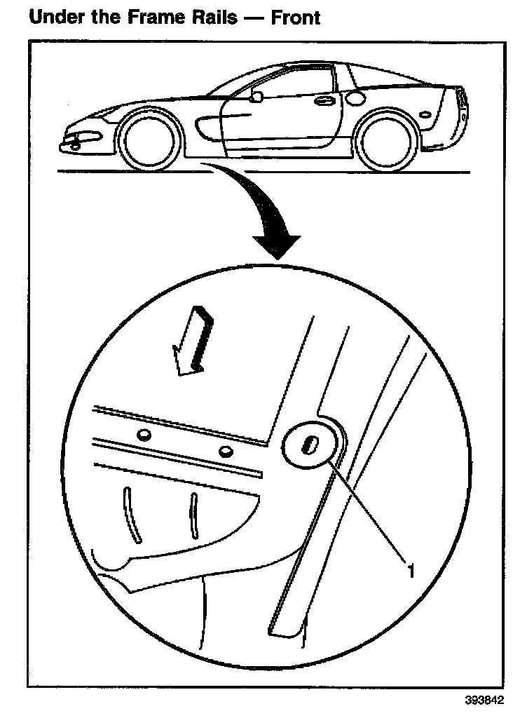 When you are lifting a vehicle with a vehicle jack or a service jack, block the wheels at the opposite end from which you are lifting. Use jack stands to provide additional support.Under The Frame Rails - Front