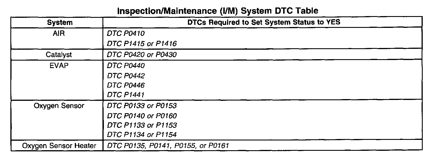 Inspection/Maitenance (I/M) System (DTC) Table