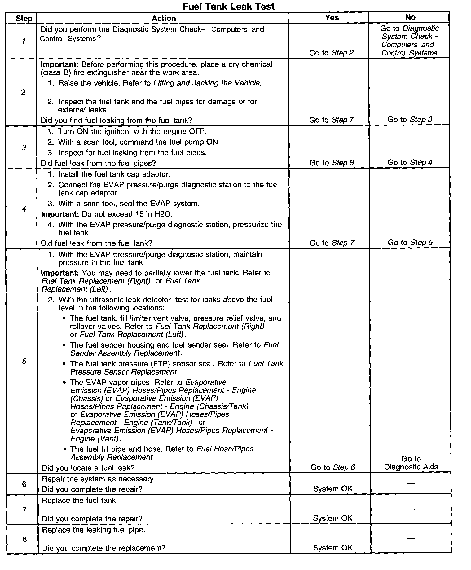 DESCRIPTIONThe fuel tank leak test is used in order to locate any fuel or fuel vapor escaping the fuel tank area. Fuel vapors escaping above the fuel level will be detected when the evaporative emission (EVAP) diagnostics completes one test cycle. The malfunction indicator lamp (MIL) will illuminate after the EVAP diagnostics completes 2 test cycles.
