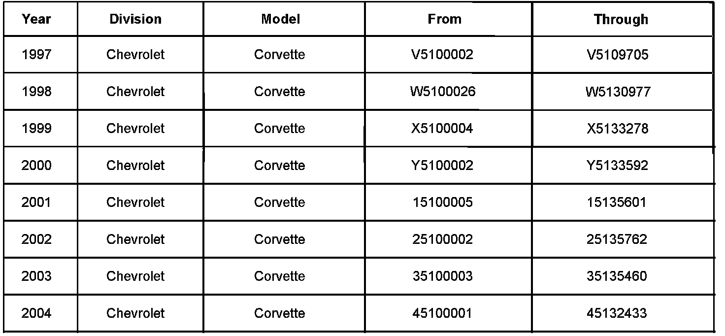 Involved are certain 1997-2004 Chevrolet Corvettes equipped with a manual transmission (MM6/M12) and 1997-2004 Chevrolet export Corvettes equipped with an automatic transmission built within the VIN breakpoints shown.