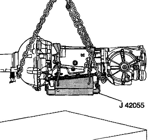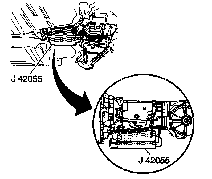 27. Position and firmly secure the J 42055 with the transmission jack to the transmission.