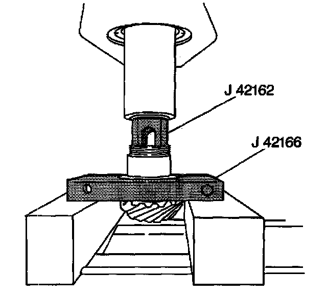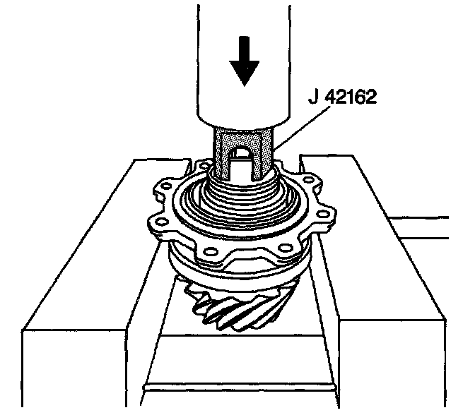 3. Use the J 42162 and a hydraulic press in order to remove the pinion shaft and bearing from the housing/cage.