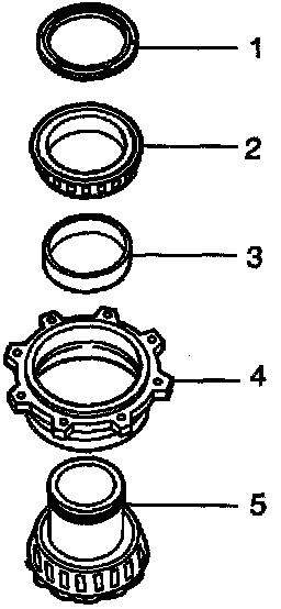 4. Remove the nut (1), bearing (2), spacer (3), and pinion shaft (5) from the housing/cage (4).