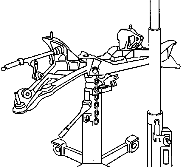 40. Guide the rear suspension crossmember alignment pins into the alignment holes in the vehicle frame rails, and guide the transaxle mount studs into the mounting holes in the crossmember, then raise the crossmember to seat to the frame rails.