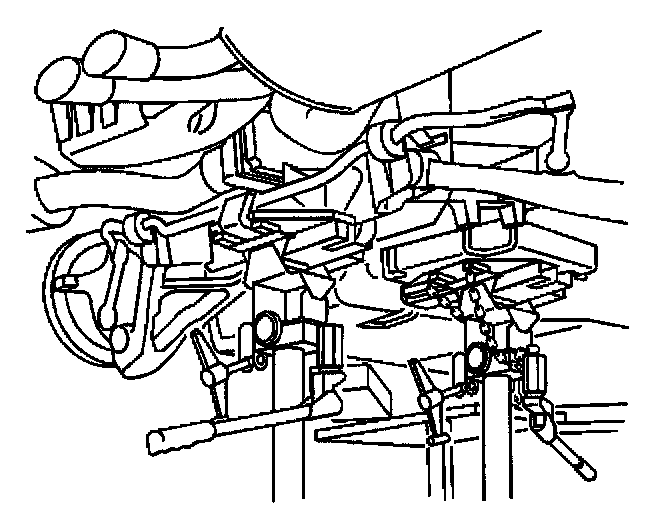 39. With the aid of an assistant, begin to raise the rear suspension crossmember (still firmly attached to a transmission jack), to the vehicle frame rails.