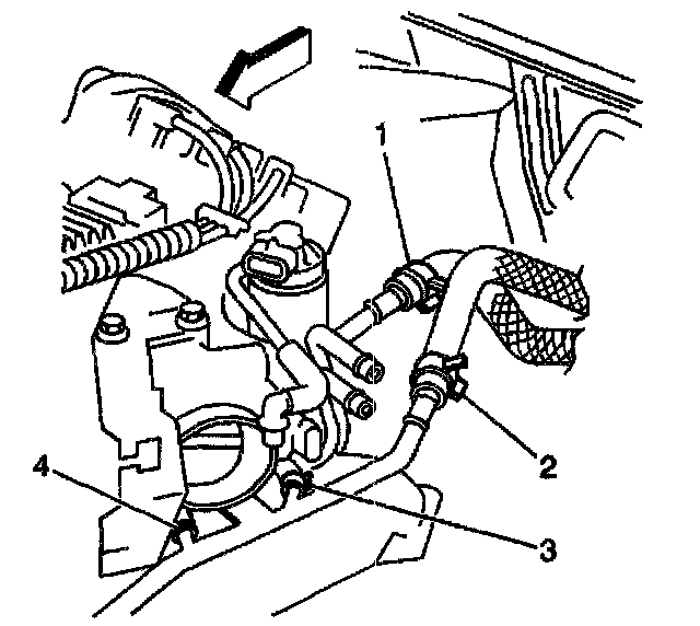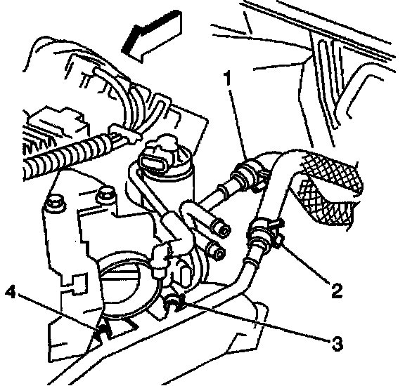 9. Remove the thermostat bypass pipe coolant hoses (3,4) from the throttle body.