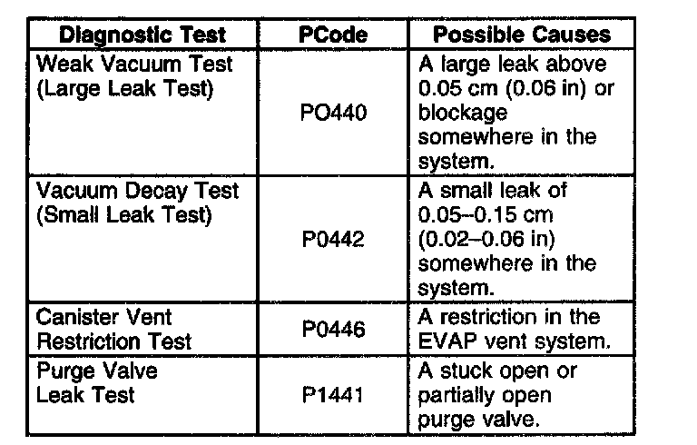 The Evaporative Emission (EVAP) control system limits the fuel vapors from escaping into the atmosphere. The EVAP transfers the fuel vapors from the sealed fuel tank to an activated carbon, or charcoal storage device the EVAP canister. The EVAP canister stores the vapors until the engine is able to use the extra fuel vapor. When the engine is able to use the extra fuel vapor, the intake air flow purges the fuel vapor from the carbon element and then the normal combustion process consumes the fuel vapor. The system is required in order to detect the evaporative fuel system leaks as small as 1 mm (0.04 inches) between the fuel filler cap and the EVAP canister purge valve. The system can test the evaporative system integrity by applying a vacuum signal, ported or manifold, to the fuel tank in order create a small vacuum.The Powertrain Control Module (PCM) then monitors the ability of the system to maintain the vacuum. If the vacuum remains for a specified period of time, then there are no evaporative leaks, and a PASS is reported by the PCM. If there is a leak, the system either will not achieve a vacuum, or a vacuum cannot be maintained. Usually a fault can only be detected after a cold start with a trip of sufficient length and driving conditions to run the needed tests. The enhanced evaporative system diagnostic conducts sub-tests in order to detect the fault conditions. If the diagnostic fails a sub-test, the PCM stores a Diagnostic Trouble Code (DTC) in order to indicate the type of fault detected.