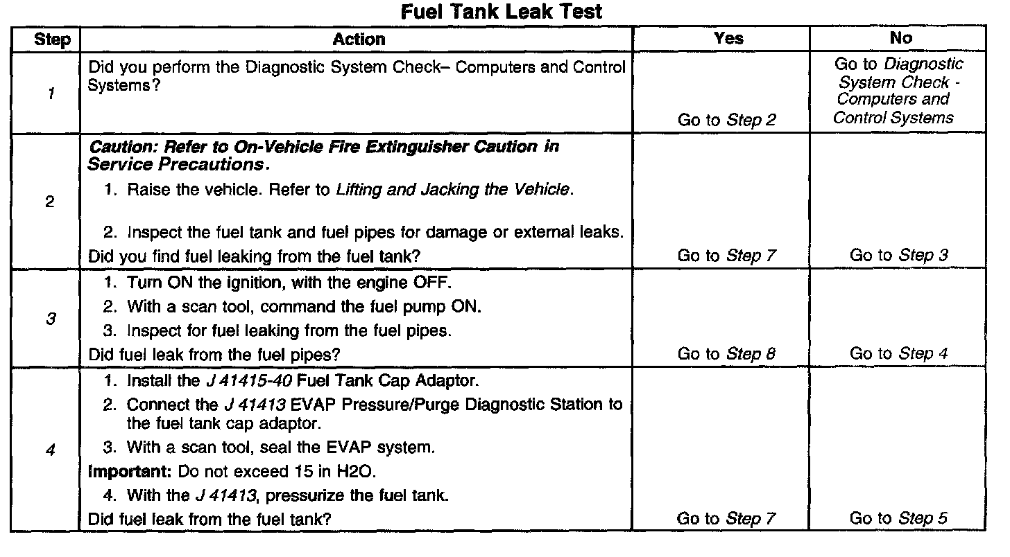 DESCRIPTIONThe fuel tank leak test is used to locate any fuel or fuel vapor escaping the fuel tank area. Fuel vapors escaping above the fuel level will be detected when the evaporative emission (EVAP) diagnostics completes one test cycle. The malfunction indicator lamp (MIL) will illuminate after the EVAP diagnostics completes two test cycles.