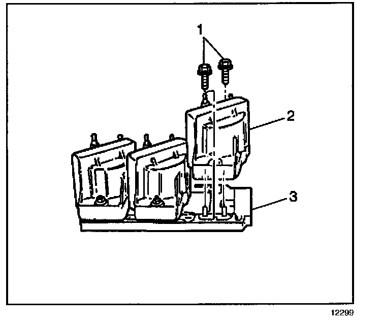 3. Remove the 2 screws (1) securing the ignition coil (2) to the ignition control module (3).