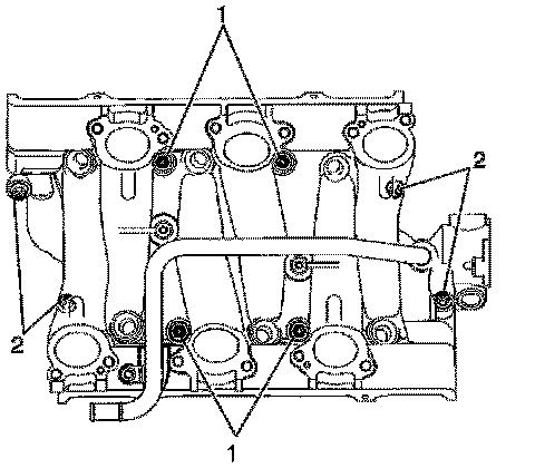 2. Tighten the diagonal lower intake manifold bolts (2) to 7 N.m (62 lb in).