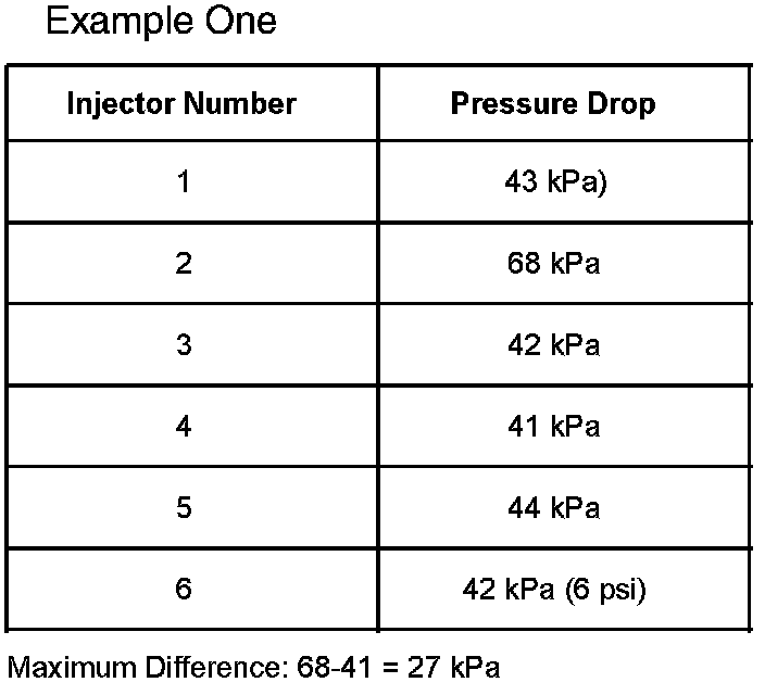 6. Subtract the lowest pressure drop, leanest injector, from the highest pressure drop, richest injector. If there is greater than or equal to a 20 kPa difference between the lowest and highest pressure drop, then the fuel injectors may be the cause of the driveability symptom. See the example tables shown to determine if cleaning is appropriate.