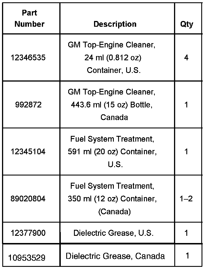 ^ Four pre-measured GM Top-Engine Cleaner Containers, 24 ml (0.812 oz) each, P/N 12346535, U.S. USAGE ONLY. In Canada, use P/N 992872, 443.6 ml (15 oz) bottle. It will be necessary to measure and dispense 48 ml (1.6 oz) of Top Engine-Cleaner into the J 35800-A, injector cleaning tool twice during this procedure. See Injector Cleaning Procedure below for further information.