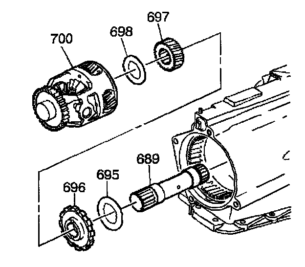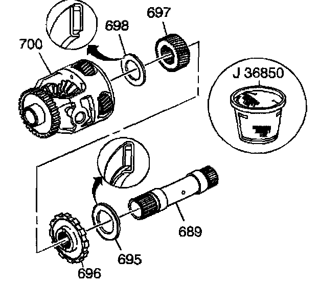 1. Assemble the sun gear thrust bearing (698), the differential carrier sun gear (697), the park gear (696), the internal gear thrust bearing (695) and the sun gear shaft (689) into the differential carrier (700).