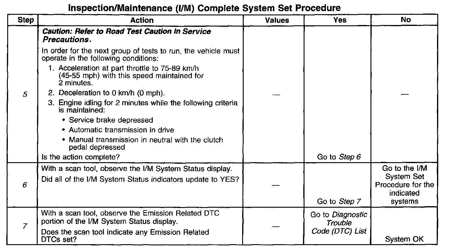 7. The I/M System Status only reports on whether or not a diagnostic has run, not the outcome of the test. If any emission related DTC sets after the tests are complete, the DTC will require diagnosis.