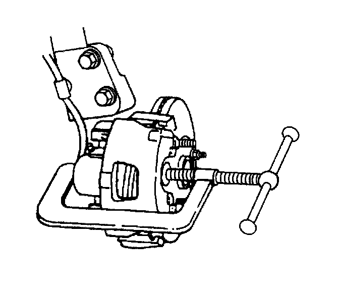 4. Install a large C-clamp, over the body of the brake caliper with the C-clamp ends against the rear of the caliper body and against the outer brake pad