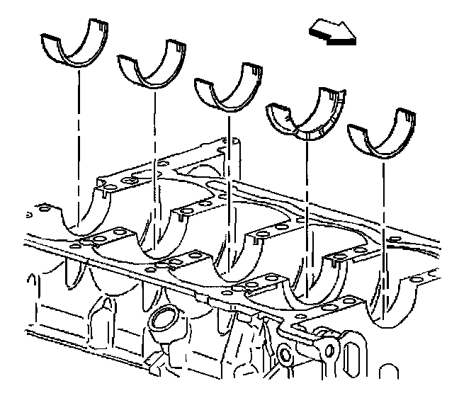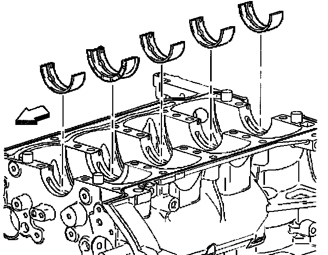 3. Install the lower bearing halves, without grooves, into the lower crankcase. Apply oil to bearing surfaces.