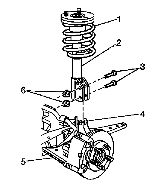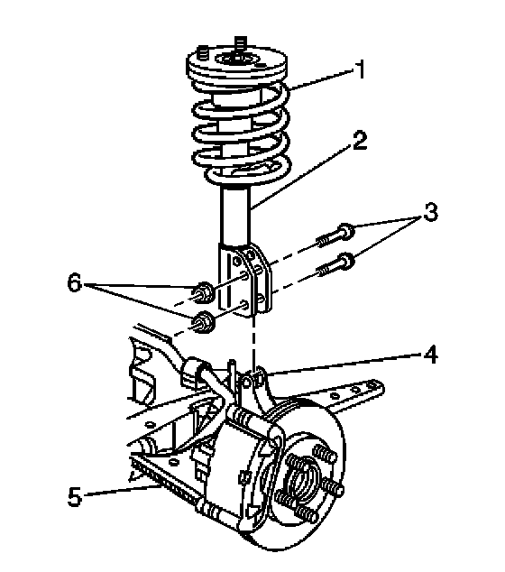 6. Remove the bolts (3) and nuts (6) that attach the steering knuckle (4) to the strut (2).