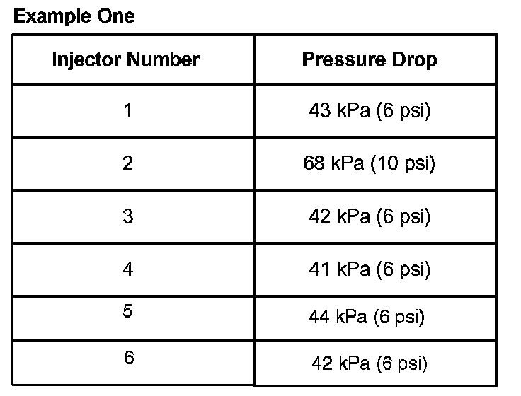 6. Subtract the lowest pressure drop, leanest injector, from the highest pressure drop, richest injector. If there is more than a 20 kPa (3 psi) difference between the lowest and highest pressure drop, then the fuel injectors may be the cause of the driveability symptom. See the example tables below to determine if cleaning is appropriate.