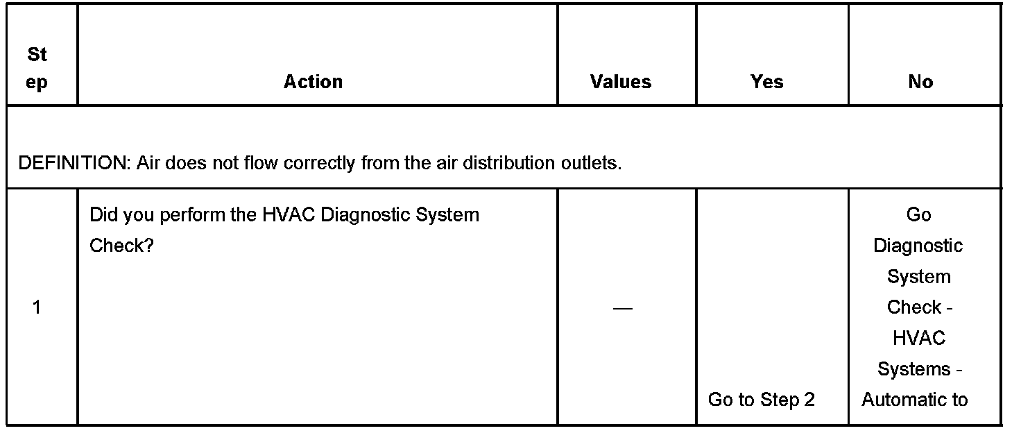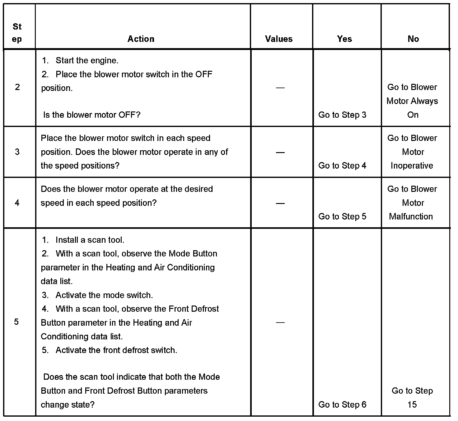 8. Tests the HVAC control module for the proper commanded state. The ON/OFF positions for each mode are as follows:FLOOR POSITION - solenoids 1 and 5 OFF, solenoids 2 and 3 ON, solenoid 4 ON or OFF.VENT POSITION - solenoids 1 and 3 OFF, solenoids 2 and 5 ON, solenoid 4 ON or OFF. VENT/FLOOR POSITION - solenoids 1, 3 and 5 OFF, solenoid 2 ON, solenoid 4 ON or OFF.FLOOR/DEFROST POSITION - solenoids 1, 2, 4 and 5 OFF and solenoid 3 ON.DEFROST POSITION - solenoids 1 and 3 ON and solenoids 2, 4 and 5 OFF.