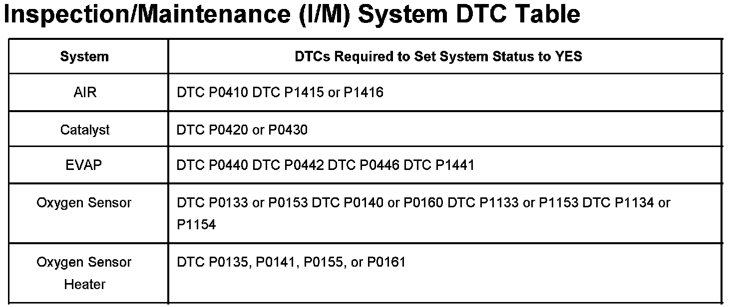 Inspection/Maintenance (I/M) System DTC Table: