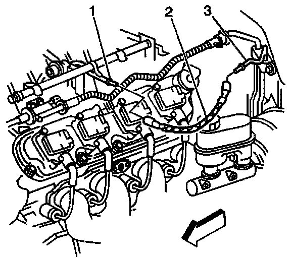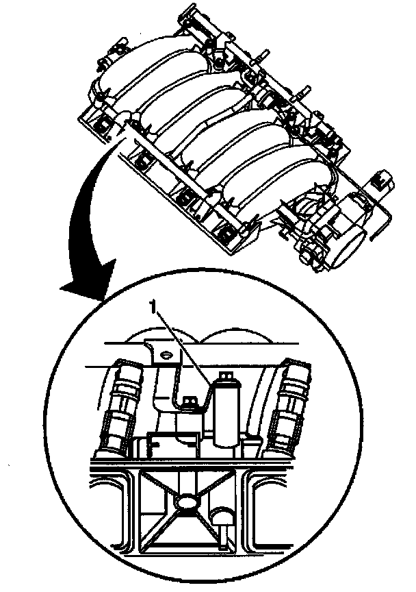 1. Note the location of the fuel rail ground strap (1) on the intake manifold. The fuel rail ground strap must be installed during assembly.
