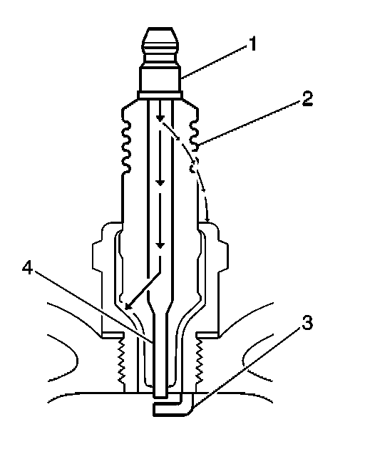 - Inspect for signs of tracking that occurred near the insulator tip instead of the center electrode (4).