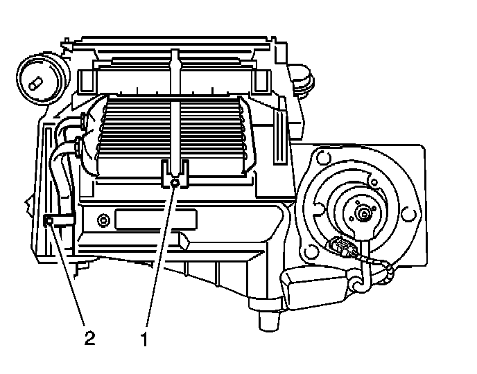 14. Remove and discard the heater core upper seal (2) from the HVAC module case - lower.