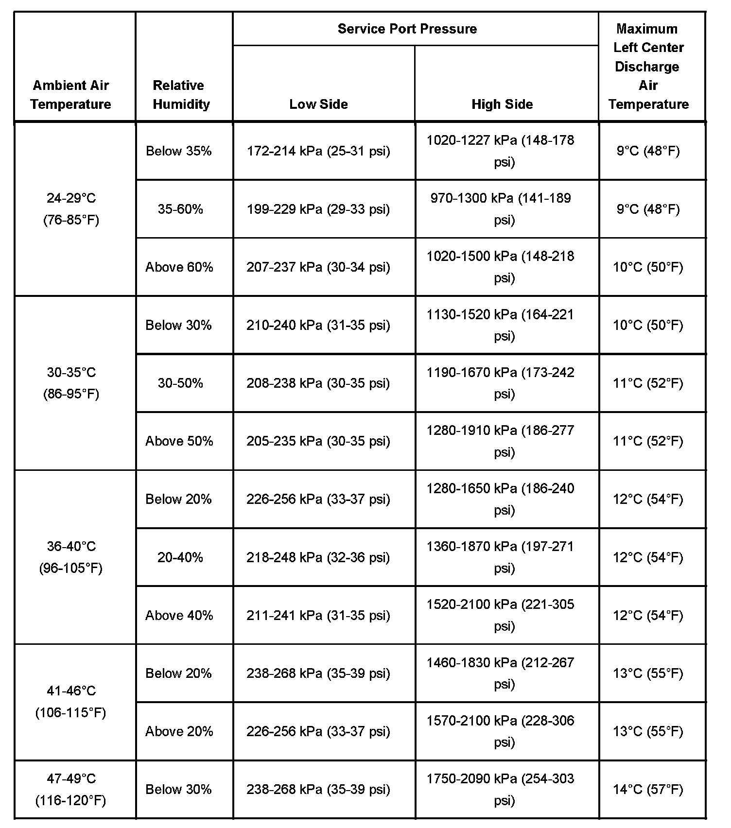 A/C Performance Table Part 1:
