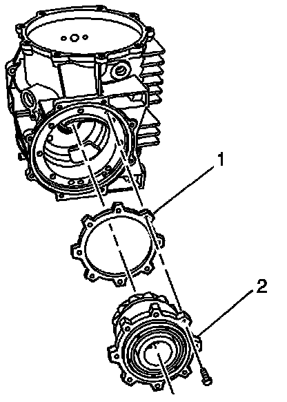 6. Install the pinion housing assembly (2) and the selected shim or shims (1) to the differential housing. Refer to Drive Pinion Shim Selection for shim selection.