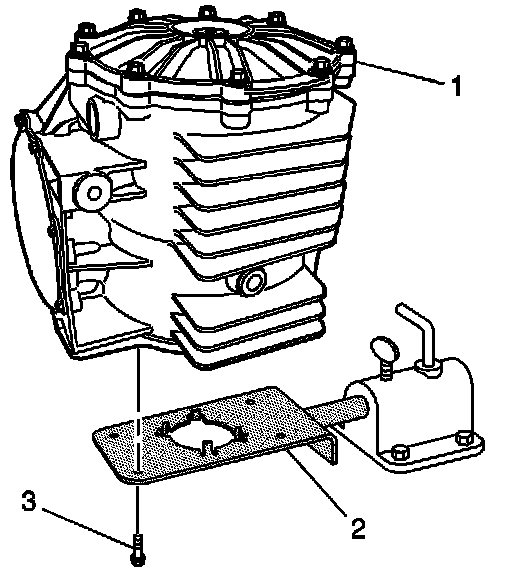 Apply thread locker GM P/N 1052942 (Canadian P/N 10953466) or equivalent to the threads of the bolts (2) and stud (1). Apply threadlocker only to the end of the stud that installs into the mount.