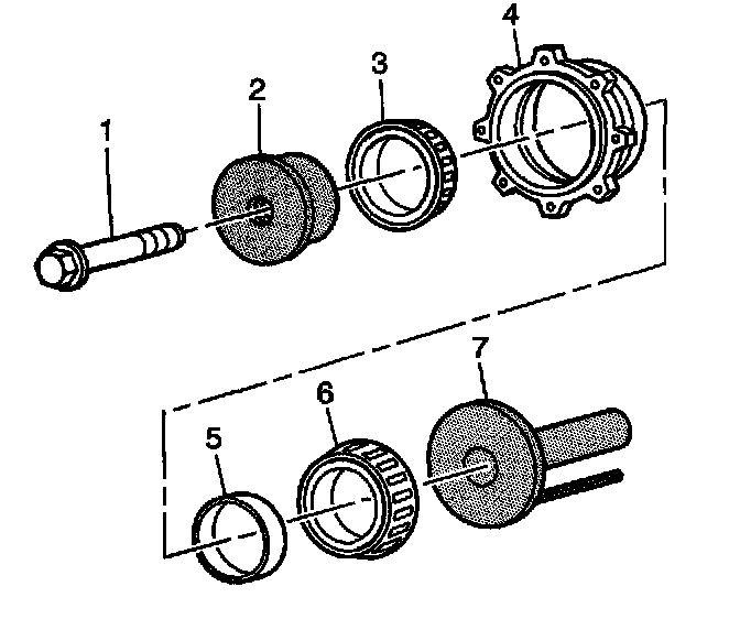6. Install the J 42168-11 (2), bearings (3 and 6), spacer (5), J 42168-2 (7), and bolt (1) to the pinion housing/cage (4). Tighten the bolt until sung.