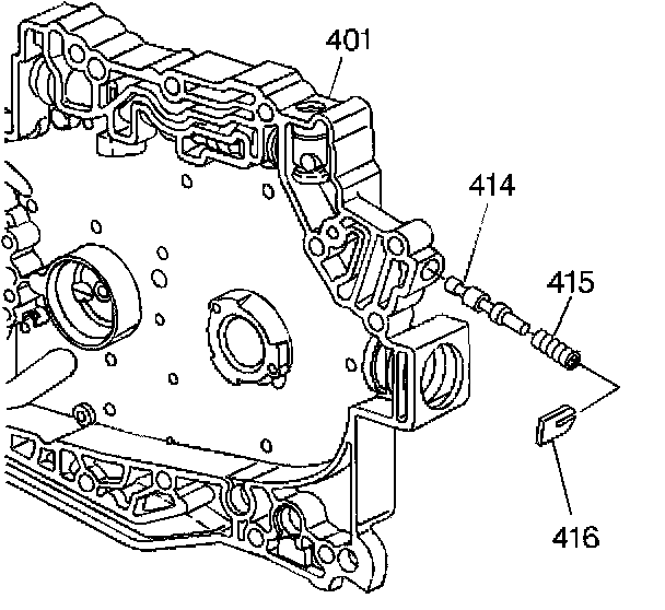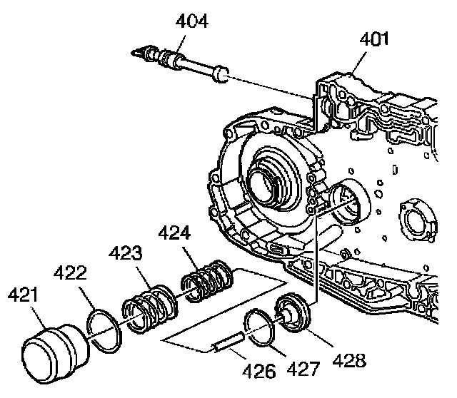 2. Remove the 3-4 accumulator piston cylinder (421) and the 3-4 accumulator piston O-ring seal (422). Use low pressure compressed air from the valve body side if necessary for removal.