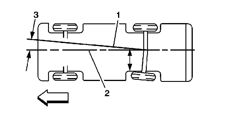 In the illustration, toe-in is shown on the left rear wheel, moving the thrust line (1) off center. The resulting deviation from the centerline is the thrust angle.