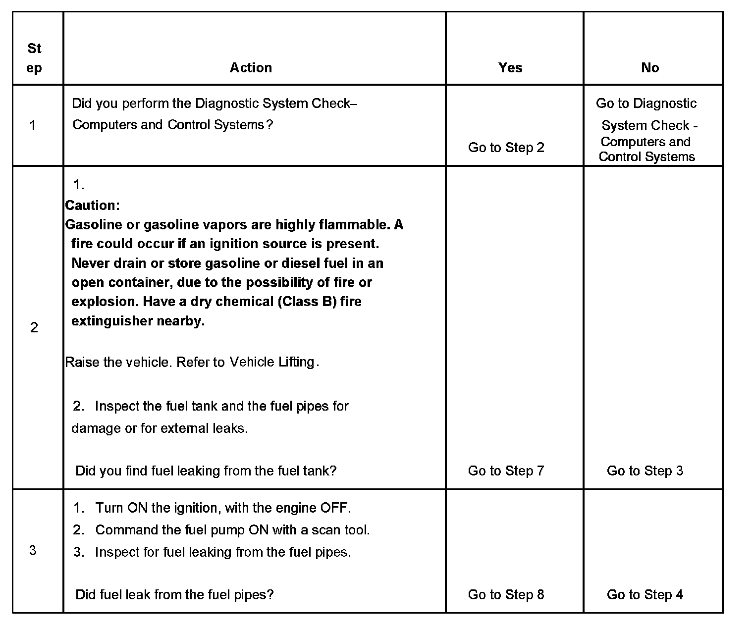 The numbers below refer to the step numbers on the diagnostic table.