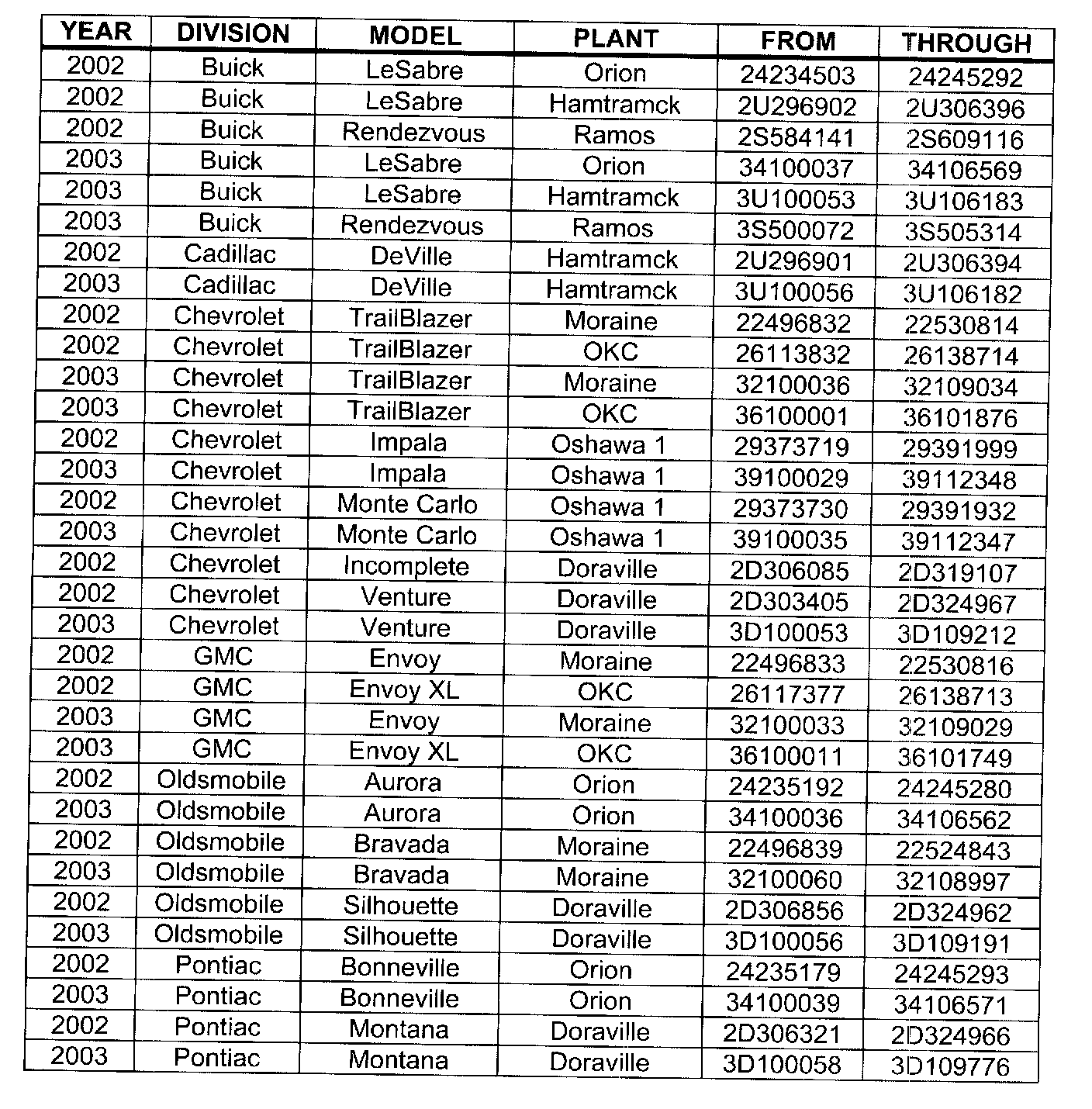 Involved are certain 2002 - 2003 Buick LeSabre, Rendezvous; Cadillac DeVille; Chevrolet Impala, Monte Carlo, TrailBlazer, Venture; GMC Envoy; Oldsmobile Aurora, Bravada, Silhouette; Pontiac Bonneville, and Montana model vehicles and built within these VIN breakpoints shown.