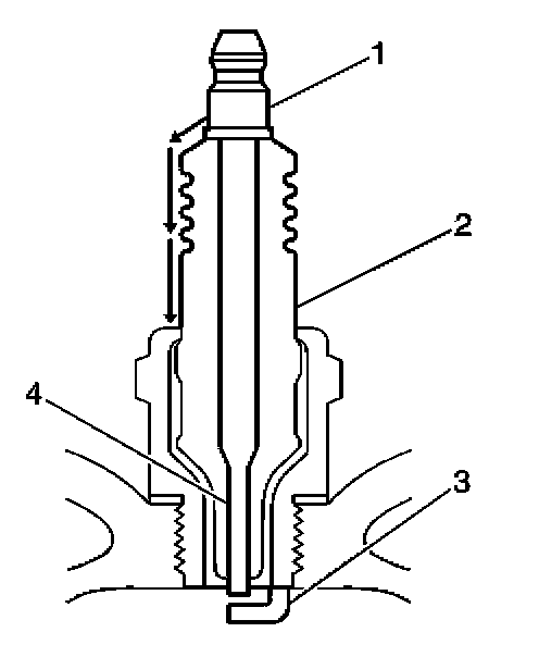 - Inspect the insulator (2) for cracks. All or part of the electrical charge may arc through the crack instead of the electrodes (3, 4).