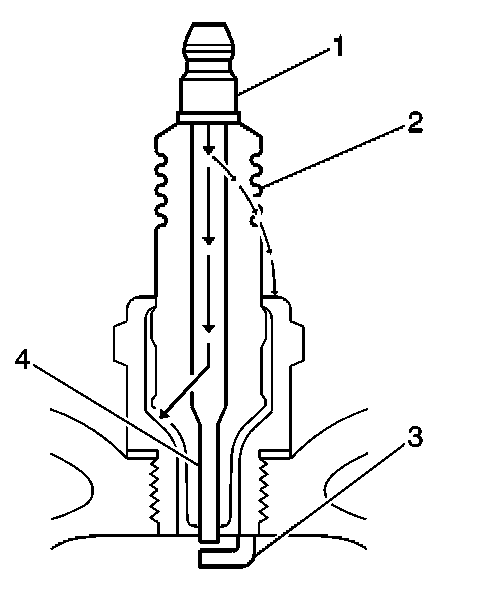 - Inspect for signs of tracking that occurred near the insulator tip instead of the center electrode (4).