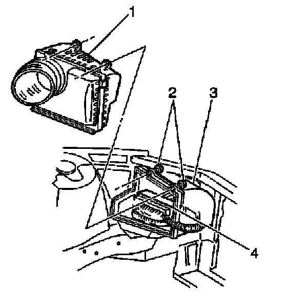 3. Without disconnecting the PCM connectors, remove the PCM (4) and the harness from the air cleaner housing.