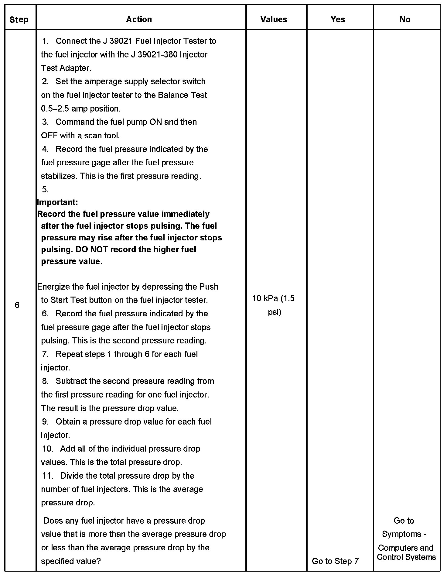 6. If the pressure drop value for each fuel injector is within 10 kPa (1.5 psi) of the average pressure drop value, the fuel injectors are flowing properly. Calculate the pressure drop value for each fuel injector by subtracting the second pressure reading from the first pressure reading. Refer to the illustration.