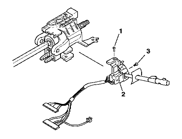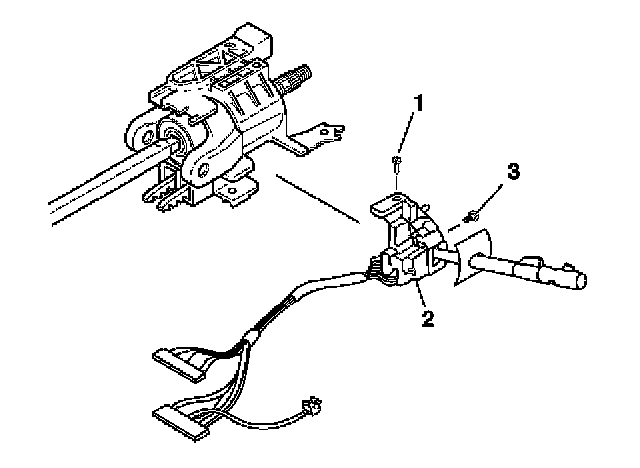 7. Remove the 2 pan head tapping screws (1) and (3) from the turn signal and multifunction switch assembly (2).