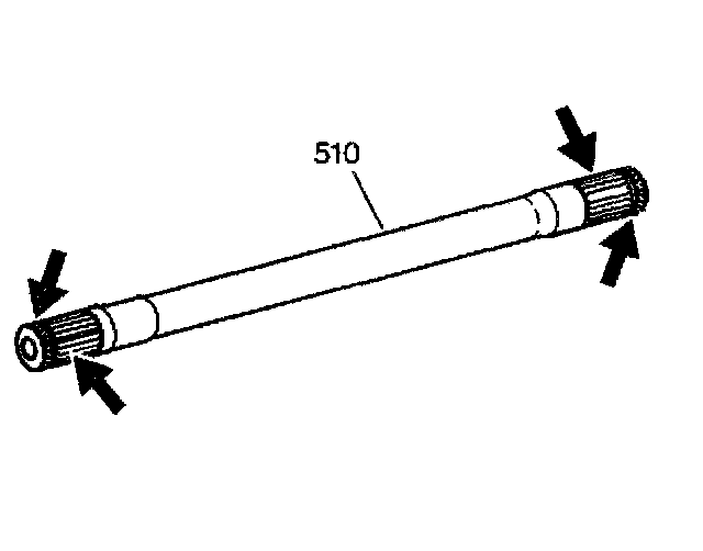 2. Hold the front differential carrier in place and carefully install the output shaft (510) to the transmission through the left wheel opening. Extend the output shaft through the differential side gear.