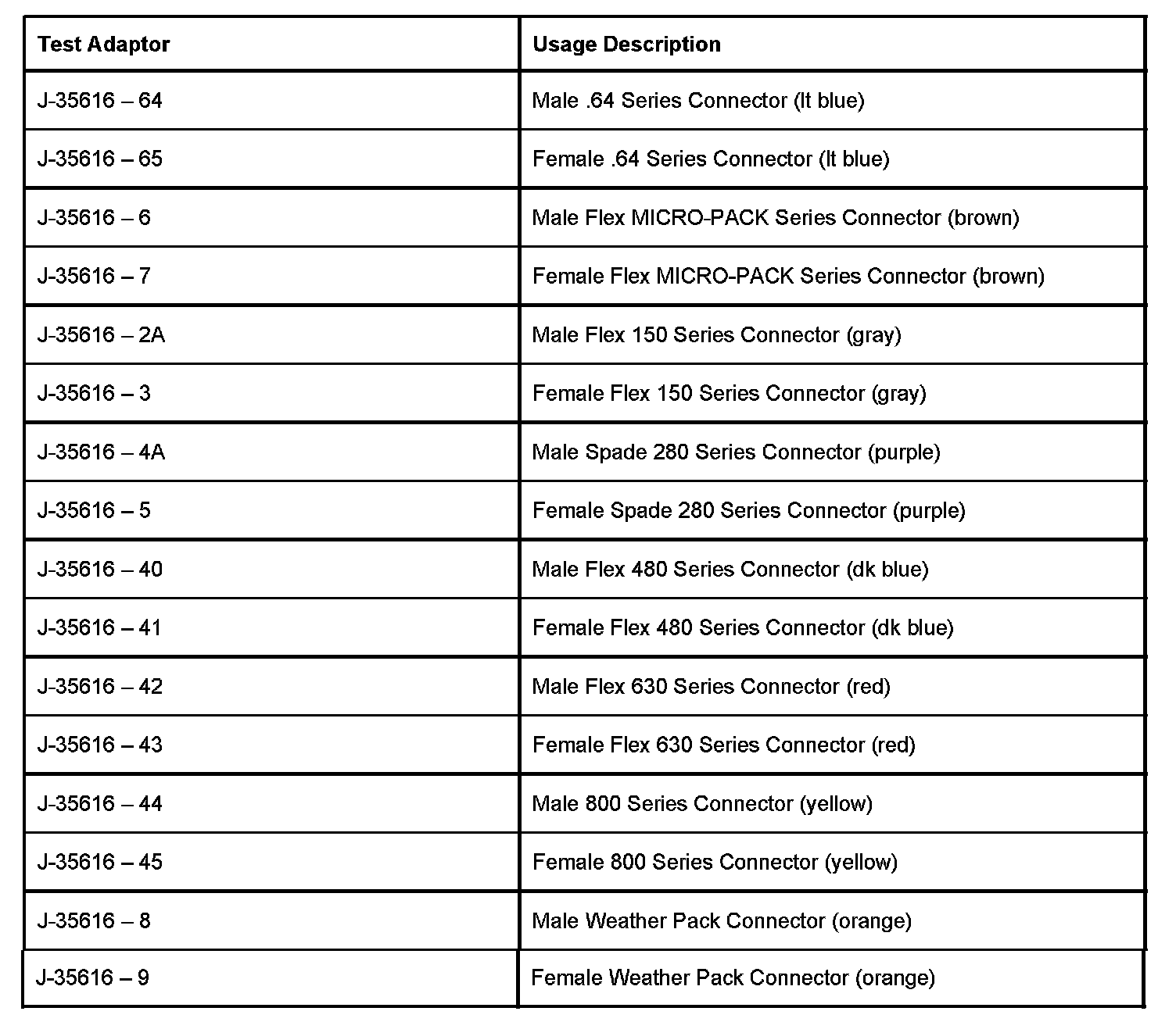 Refer to the table as a guide in selecting the correct test adapter for frontprobing connectors: