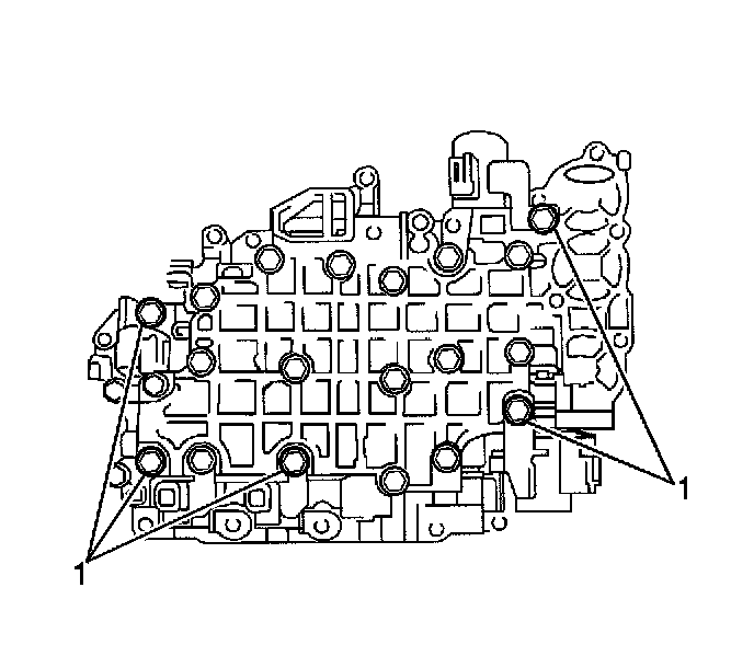 10. Install the 5 shift solenoid valves with the 5 bolts (1). The bolt lengths are 49 mm (1.93 inch) and 20 mm (0.79 inch).