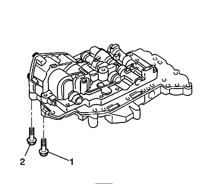Install the 2 bolts to the valve body. The bolt lengths are 49 mm (1.93 inch) (1) and the 36 mm (1.42 inch) (2).
