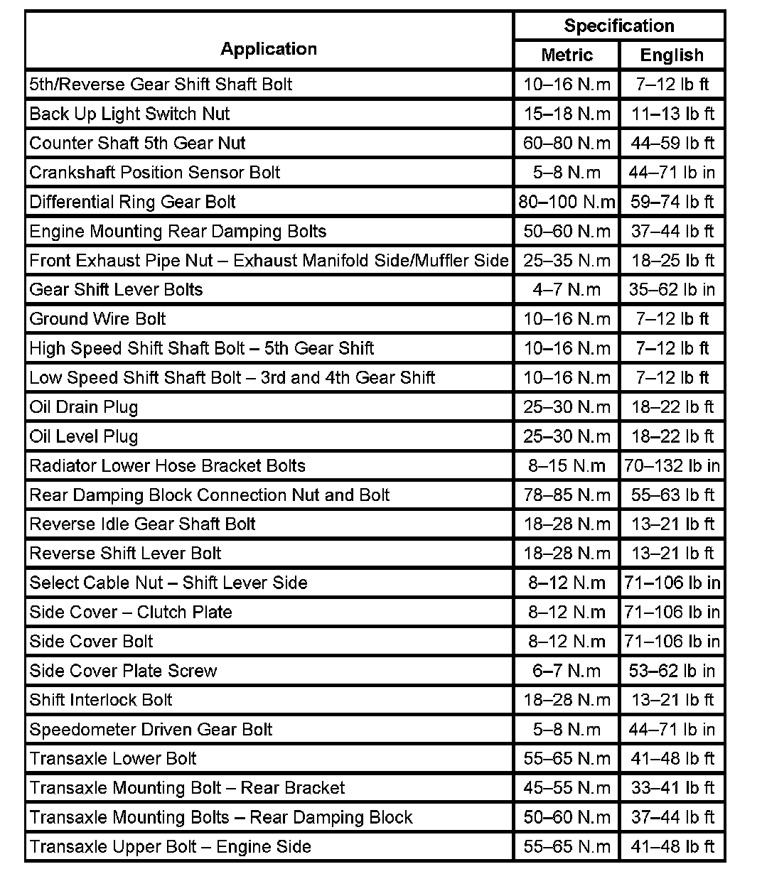 Fastener Tightening Specifications: