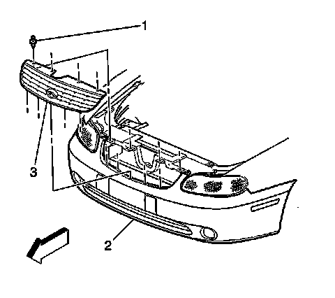 3. Disconnect the grille (3) from the front bumper fascia (2).