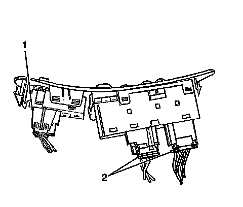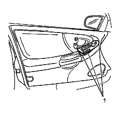 1. Using a small flat-bladed tool to release the power accessory switch panel retainers (1) from the door trim panel, push in and lift up. Start at the front of the panel.