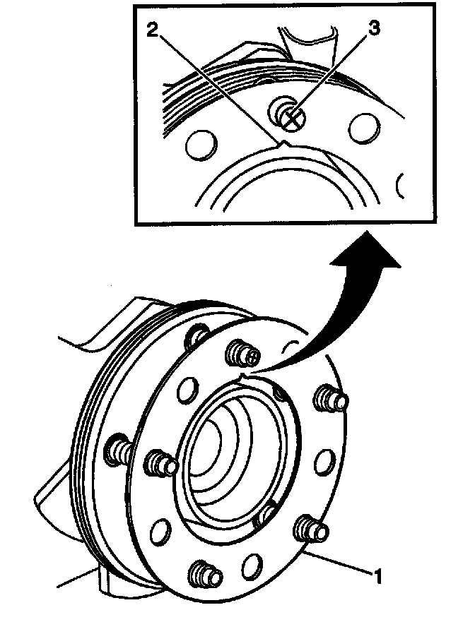 6. Install the correction plate (1) onto the hub/axle flange, with the V-shaped notch (2) orientated to align with the high spot mark (3), that was positioned to face upward.