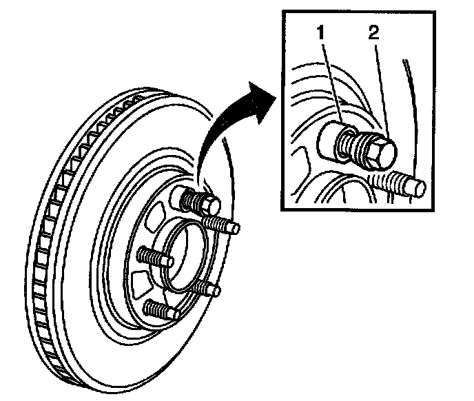 8. Hold the rotor firmly in place against the hub/axle flange and install one of the J45101-100 (1) and one lug nut (2) onto the upper-most wheel stuck.