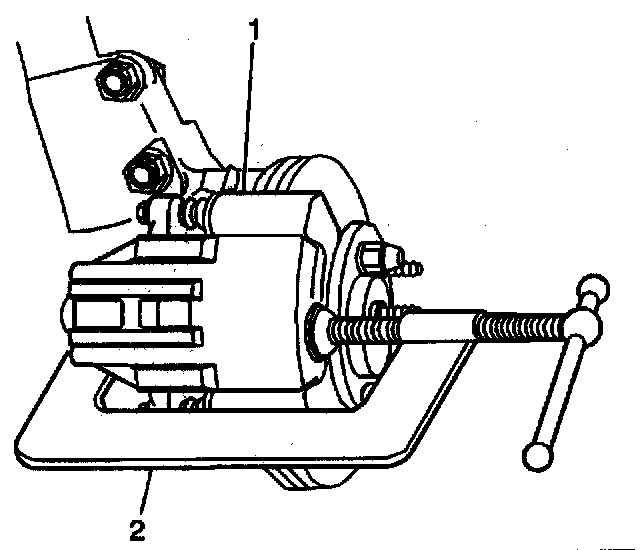 6.2. Slowly tighten the C-clamp (2) until the piston is pushed into the caliper bore far enough to slide the caliper assembly off the rotor.